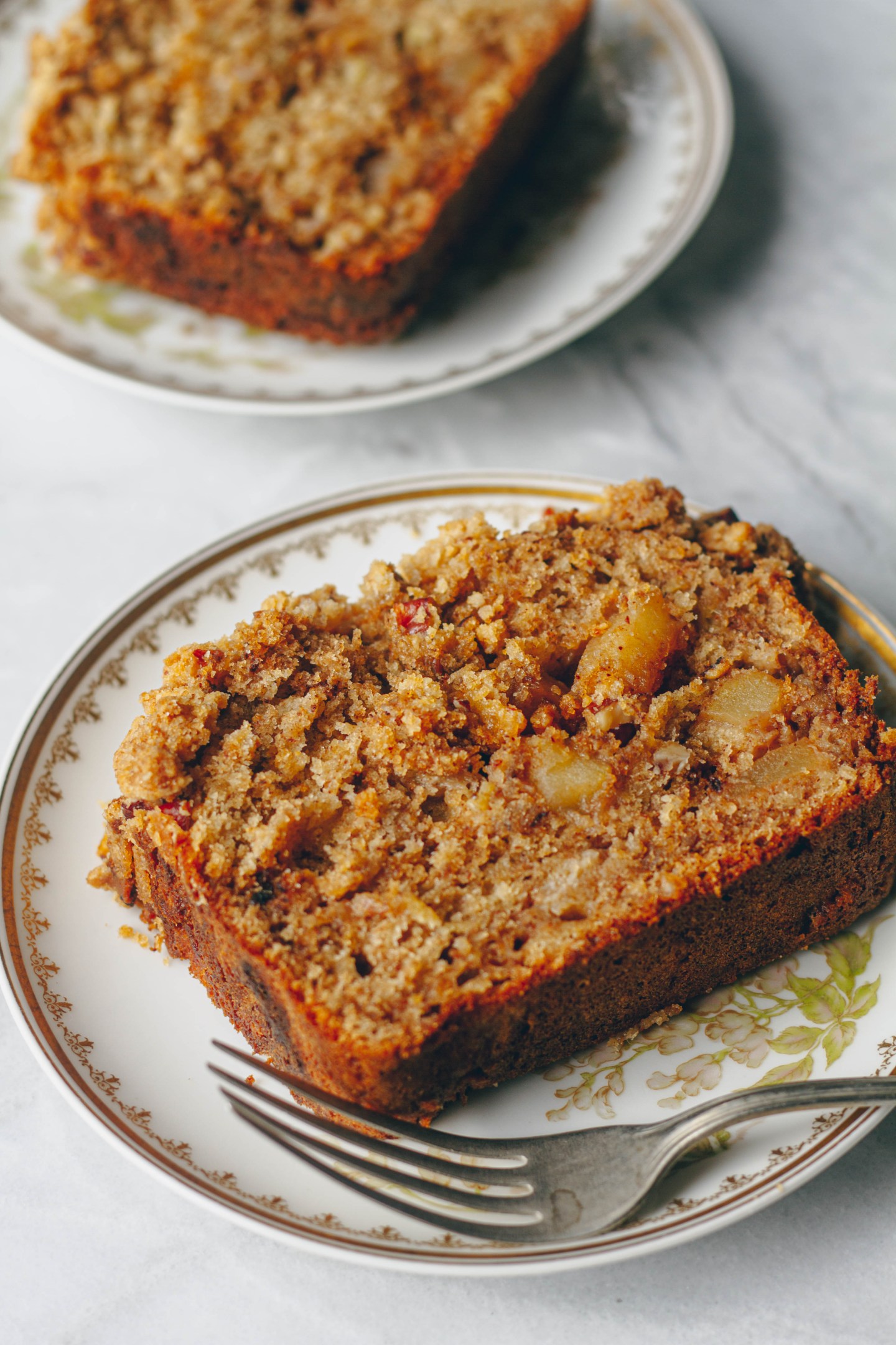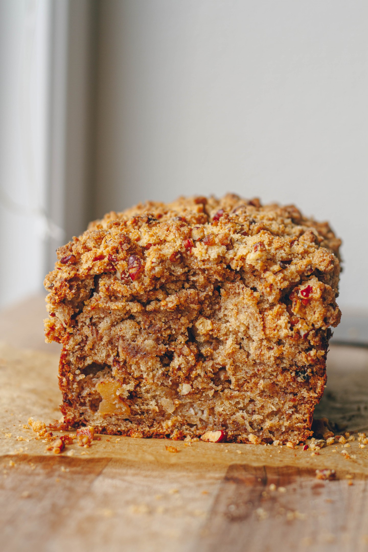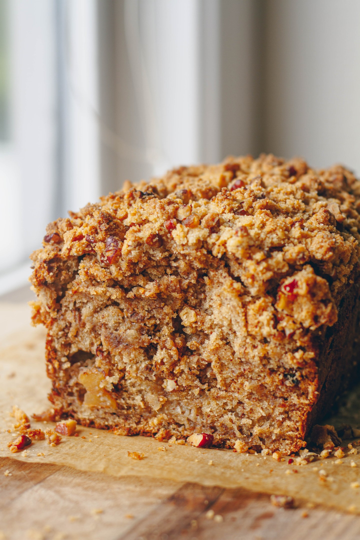 Fluffy and moist banana bread with chunks of cinnamon stewed apples and topped with a pecan streusel.