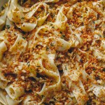 Tagliatelle tossed in a creamy dairy-free sauce with caramelized leeks, shallots, and garlic topped with toasted thyme breadcrumbs.