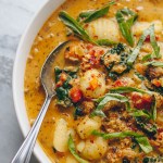 Add kale and gnocchi. Cover and cook for 5-10 minutes or according to gnocchi pkg directions. Pour in coconut milk and cook for 2-3 minutes until soup has thickened a bit. Season with salt and pepper.