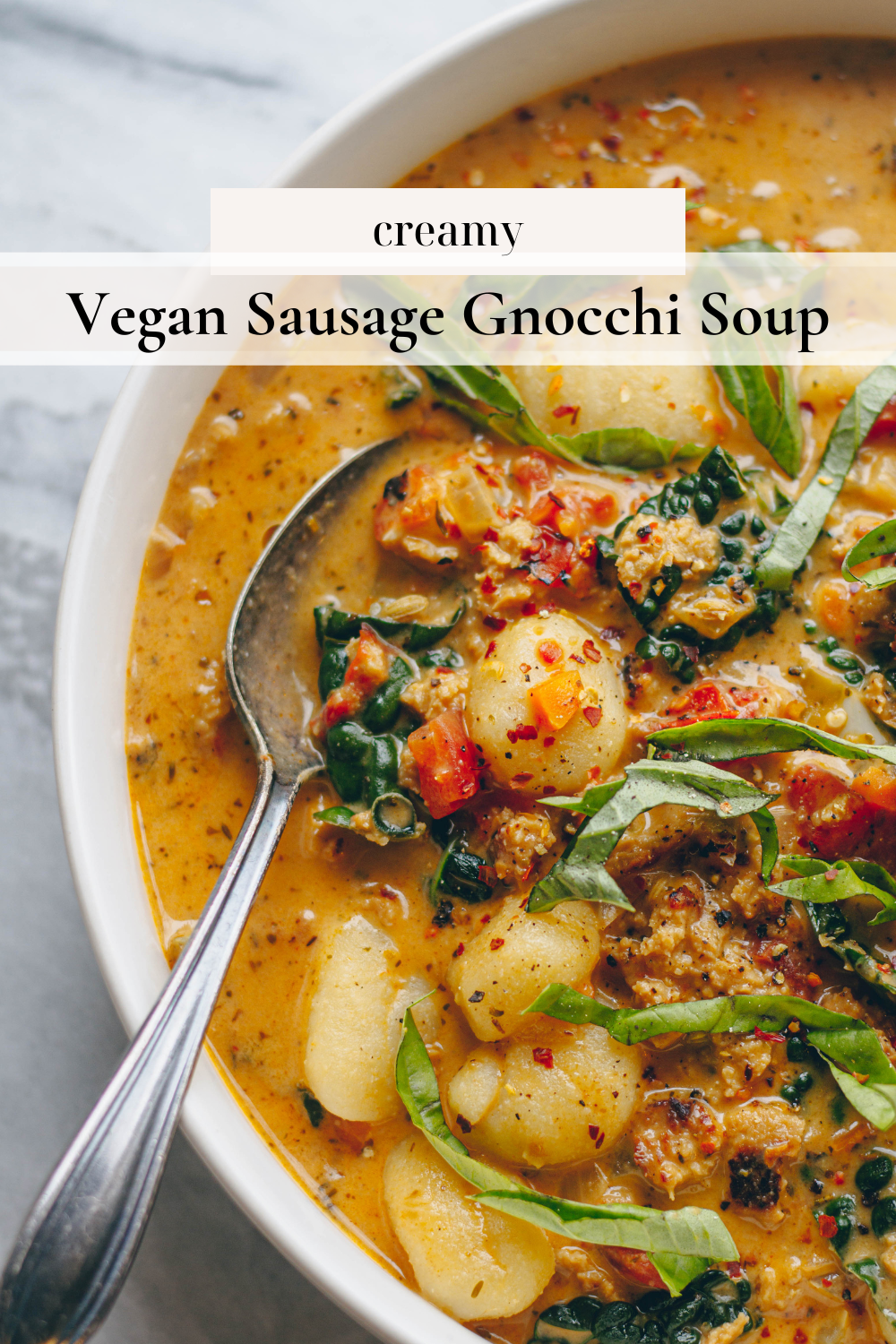 Hearty and creamy soup filled with veggies, fresh herbs, potato gnocchi, and flavorful vegan sausage.