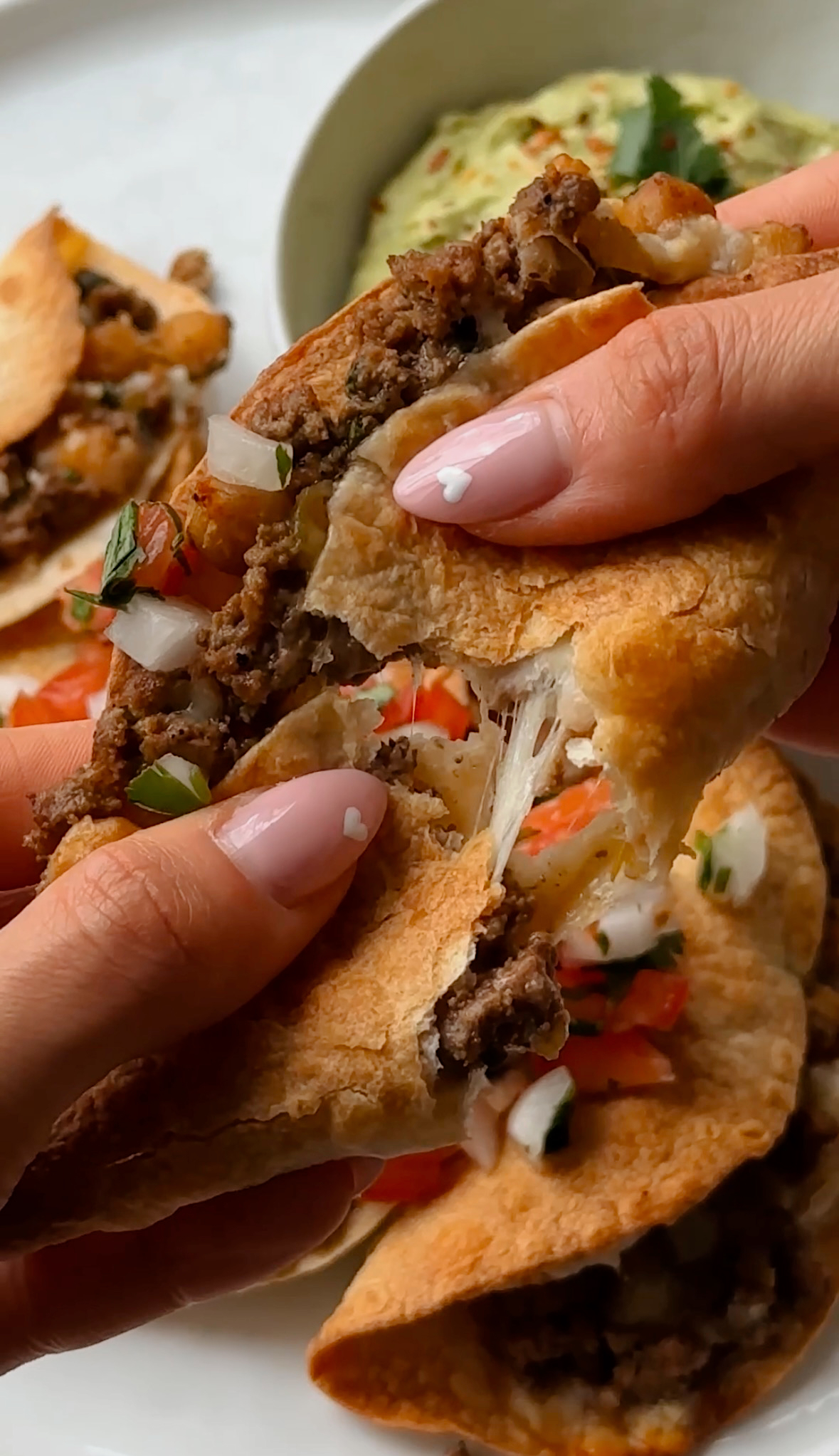 Crispy baked tacos filled with a flavorful beef and chickpea filling, melty cotija cheese, and fresh cilantro. Served with a creamy avocado cilantro crema and fresh pico de gallo.