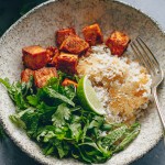 I made coconut rice for the first time, and I am obsessed. It is rich, creamy, and oh so delicious. This coconut rice is crisped to perfection and paired with a baked tofu flavored with Thai red curry paste, soy sauce, fresh ginger and garlic, dried mint, lime, brown sugar, and sesame oil.