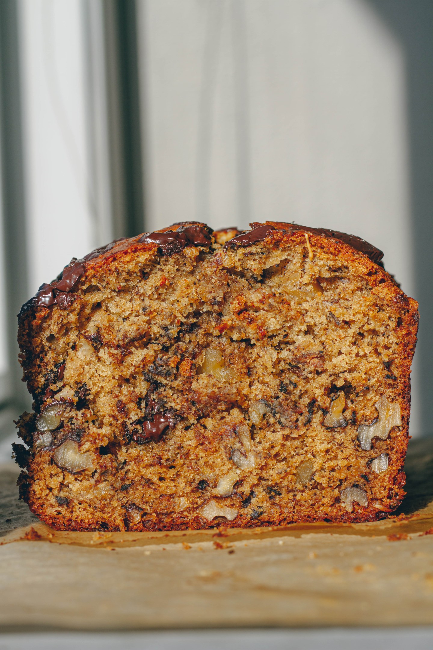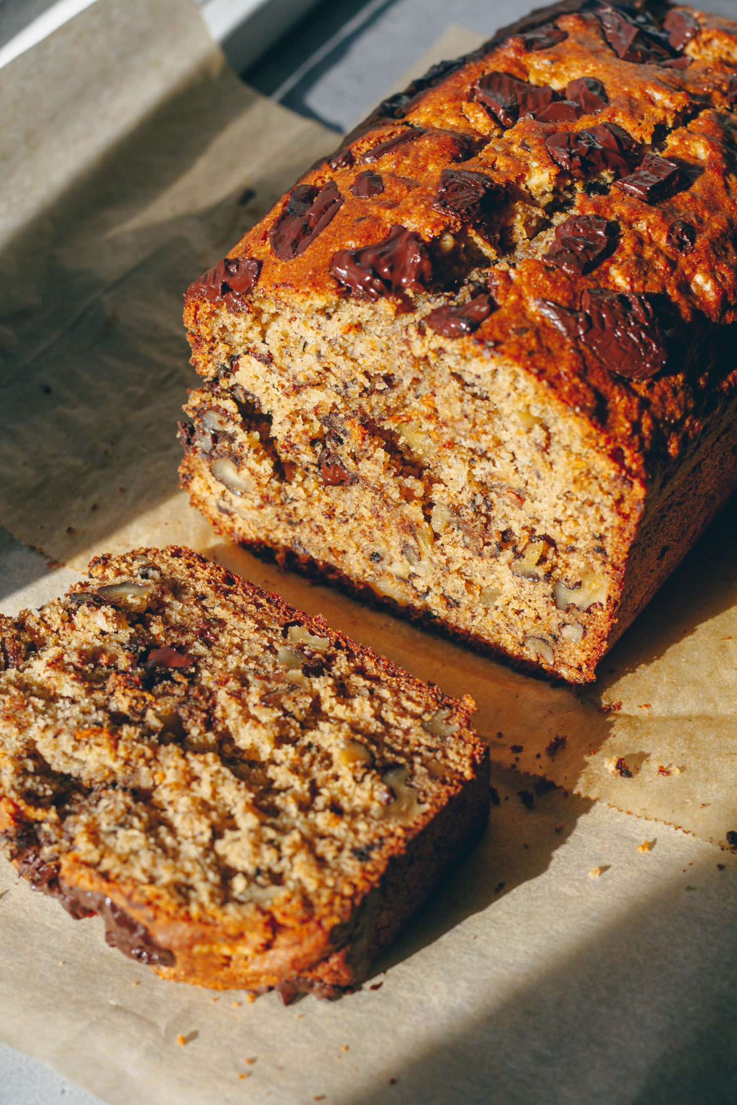 Fluffy and tender banana bread with almond butter and chunks of chocolate and walnuts.