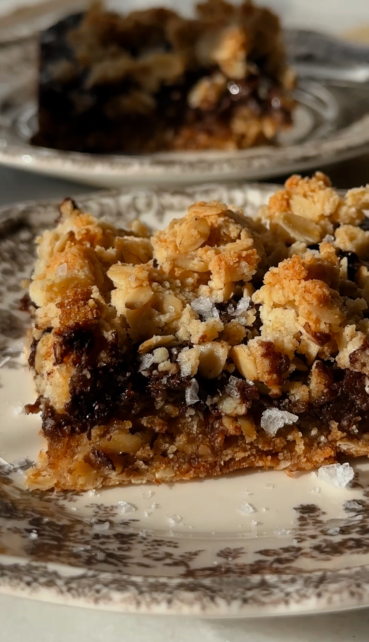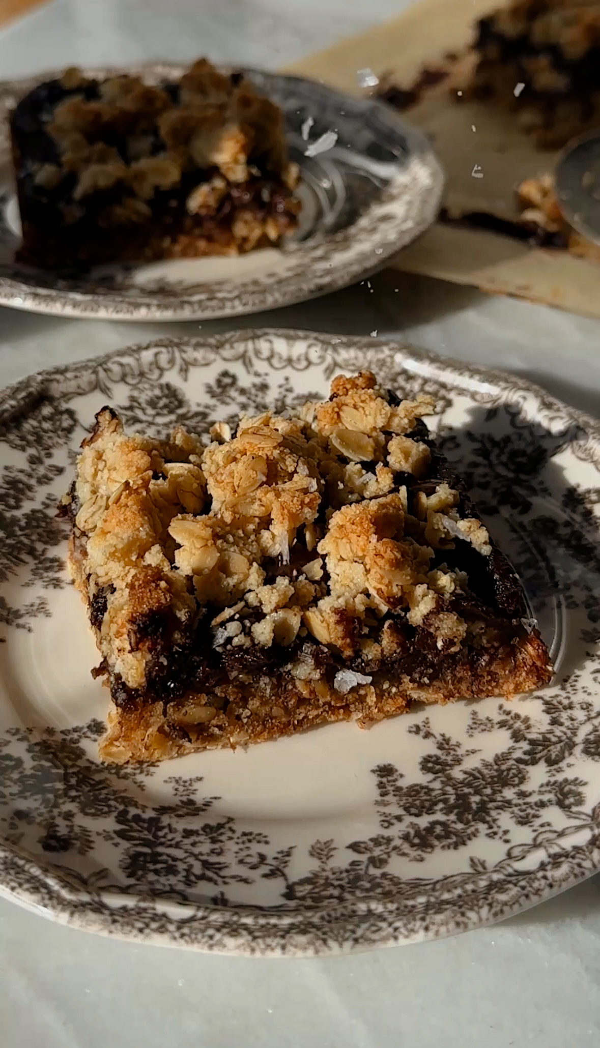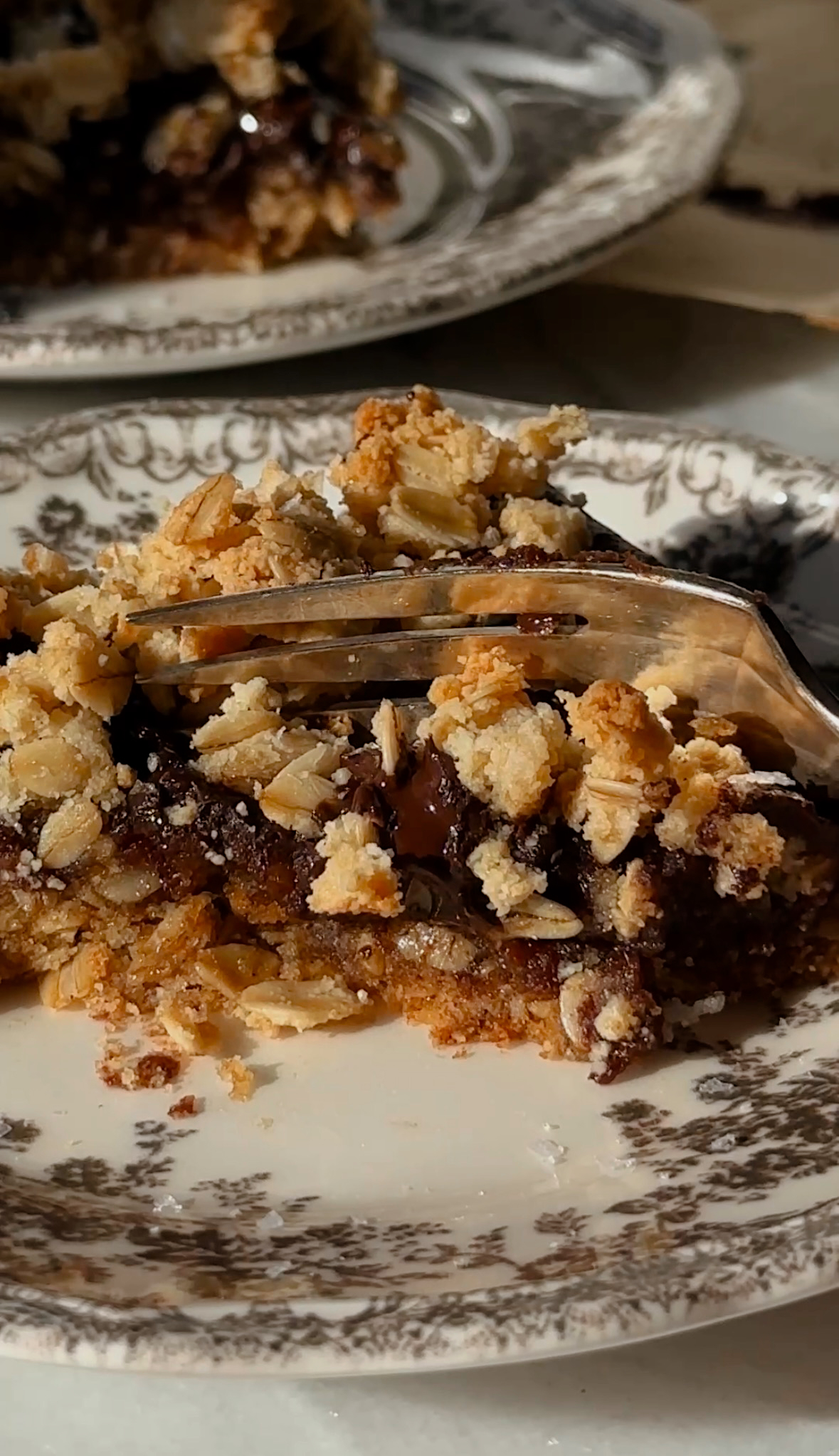 Buttery oatmeal and almond shortbread with a creamy chocolate medjool date filling, and melty pools of dark chocolate.
