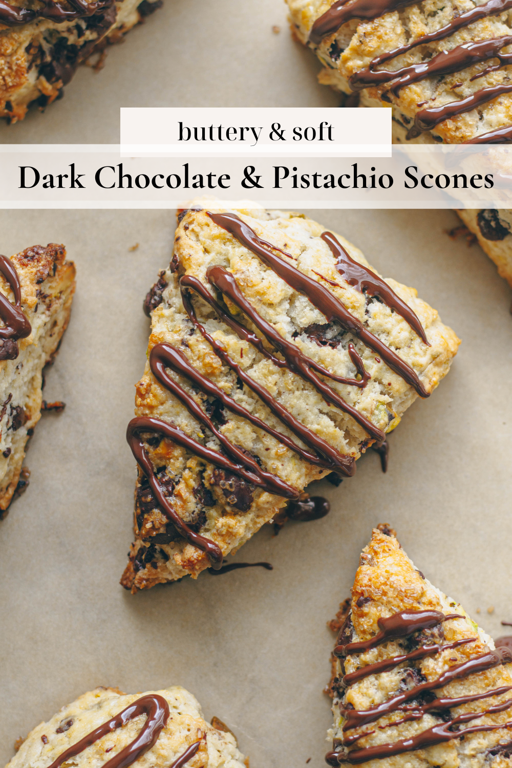 These scones are studded with crunchy and nutty pistachios and chunks of dark chocolate. Plus, drizzled with more dark chocolate for that perfect finishing touch.