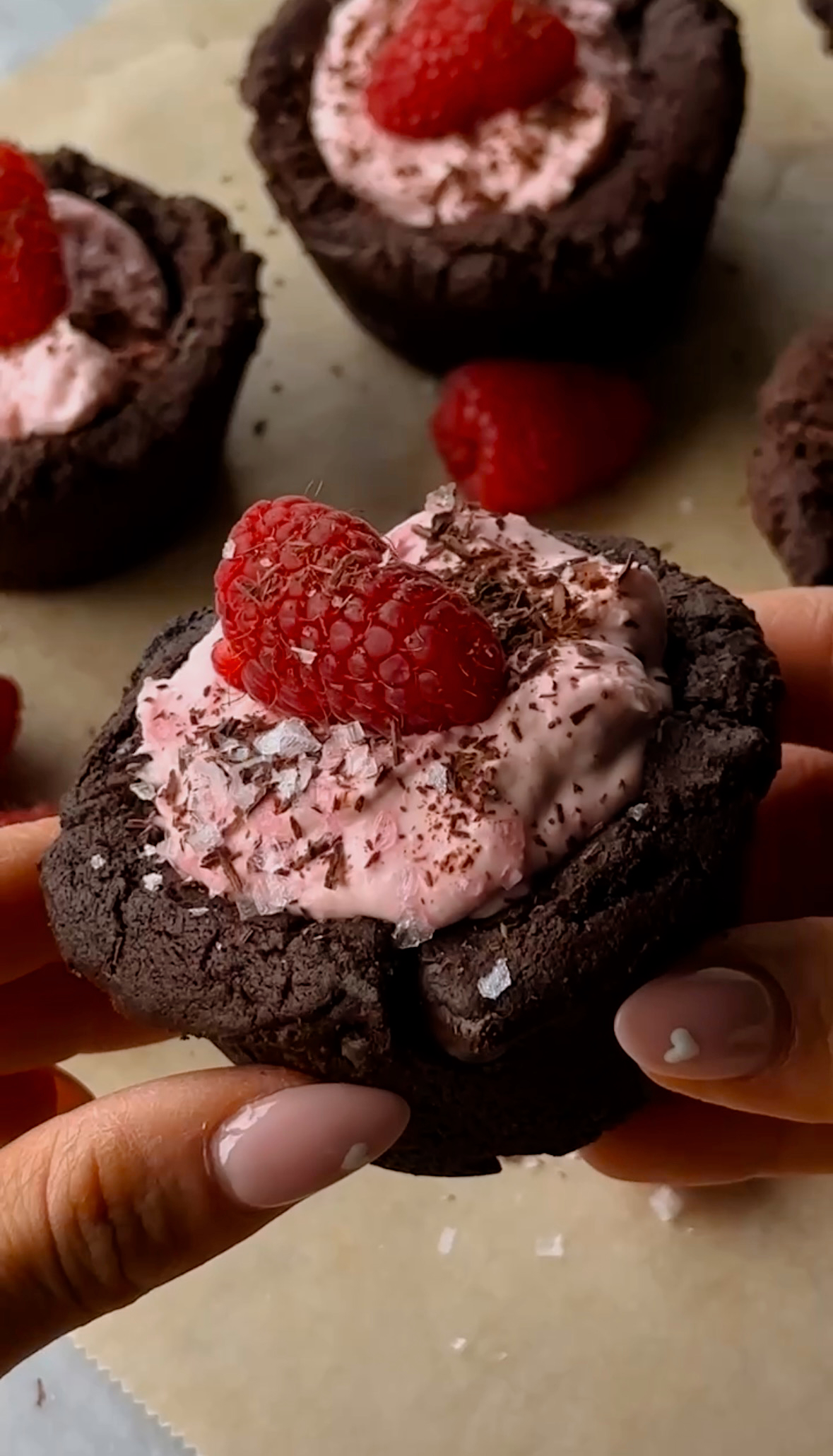 - To make the filling: Beat together all ingredients using an electric hand mixer until smooth. Chill 15-20 minutes before piping into cookie cups. Top cookie cups with fresh raspberries, chocolate shavings, and flaky sea salt.Â