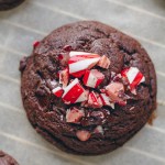 Use a 1.5-2 tbsp cookie scoop to distribute dough onto parchment-lined baking sheet. Top with additional chocolate chips. Bake for 12 minutes. Immediately out of the oven, sprinkle tops with crushed peppermint. (Optional): To create perfectly round cookies, place a mug/glass or circular cookie cutter over the warm dough and do a little swirl to form a round cookie. Allow cooling on the baking sheet for 10 minutes before transferring to a wire cooling rack.