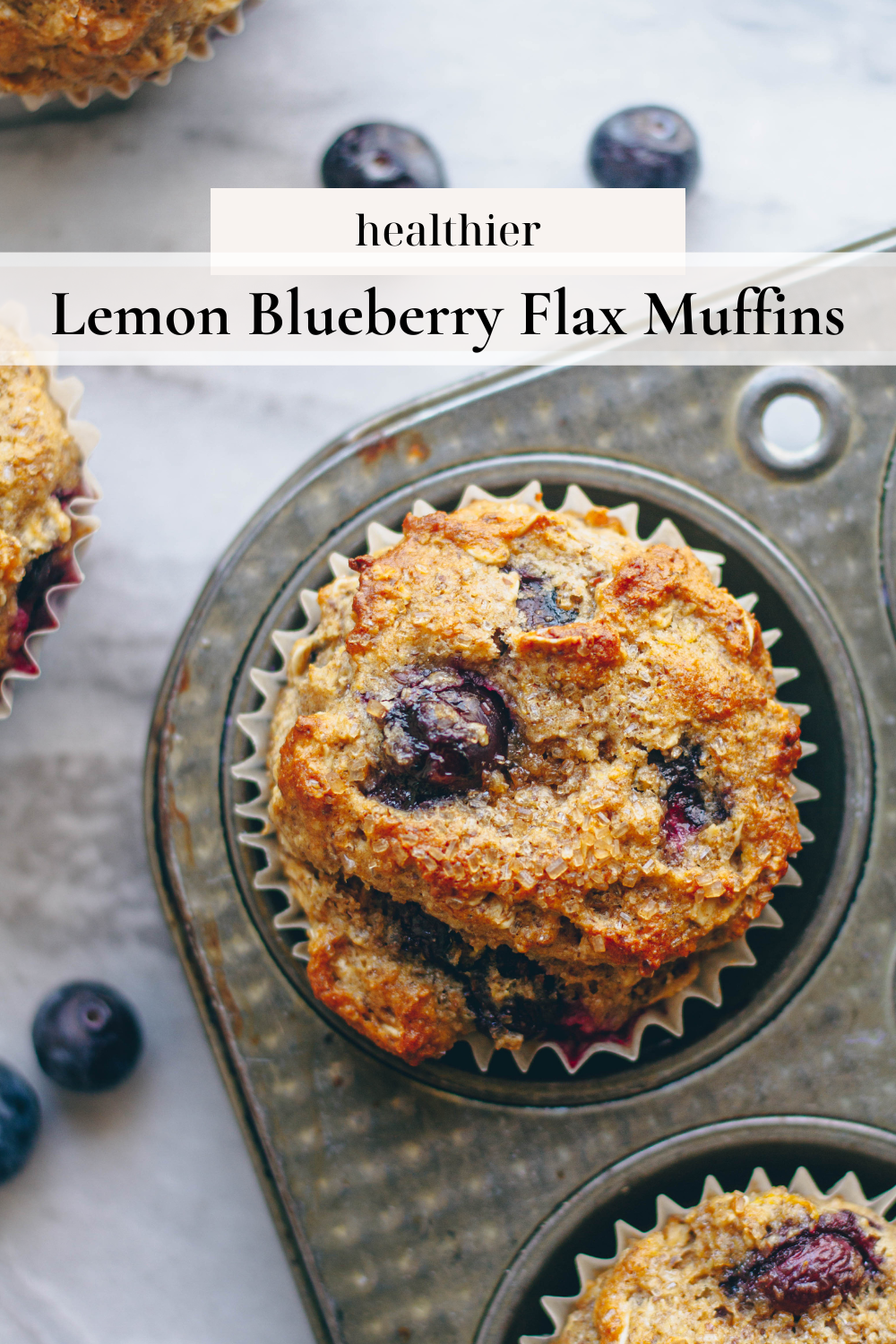 Healthier Lemon Blueberry Flax Muffins that are fiber-rich, whole grain, and lower in sugar.