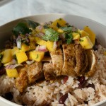 Marinated Jamaican-Inspired jerk chicken paired with flavor-packed beans and rice with a fresh mango salsa.