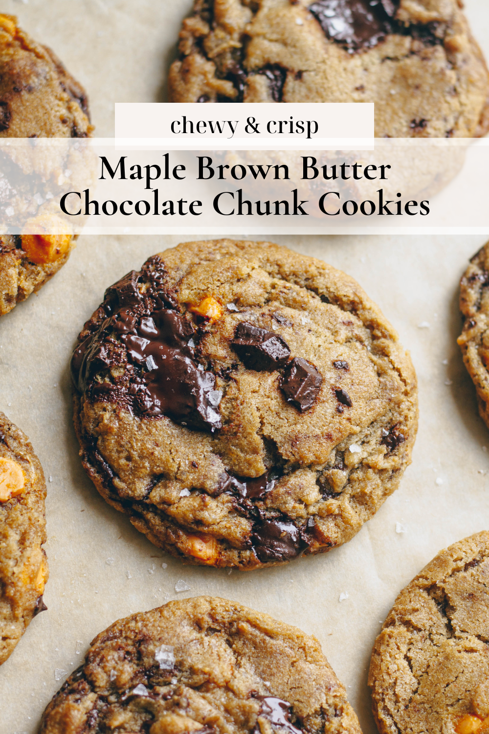 Chewy & crisp Maple Brown Butter Chocolate Chunk Cookies made with nutty brown butter, maple syrup, and chunks of gooey dark chocolate and caramel chips.