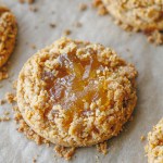- Line 2 baking sheets with parchment paper. Firmly press 2 tablespoons dough into the bottom of a 2 1/2″ round cookie cutter, then gently lift cutter to leave crust on parchment. Repeat until you’ve formed ~12 rounds of crust. Dollop 2 tsp of jam into center of each round. Sprinkle 1 tablespoon of remaining crust around border of each cookie.