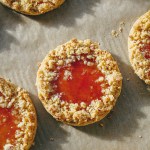 - Line 2 baking sheets with parchment paper. Firmly press 2 tablespoons dough into the bottom of a 2 1/2″ round cookie cutter, then gently lift cutter to leave crust on parchment. Repeat until you’ve formed ~12 rounds of crust. Dollop 2 tsp of jam into center of each round. Sprinkle 1 tablespoon of remaining dough around border of each cookie.