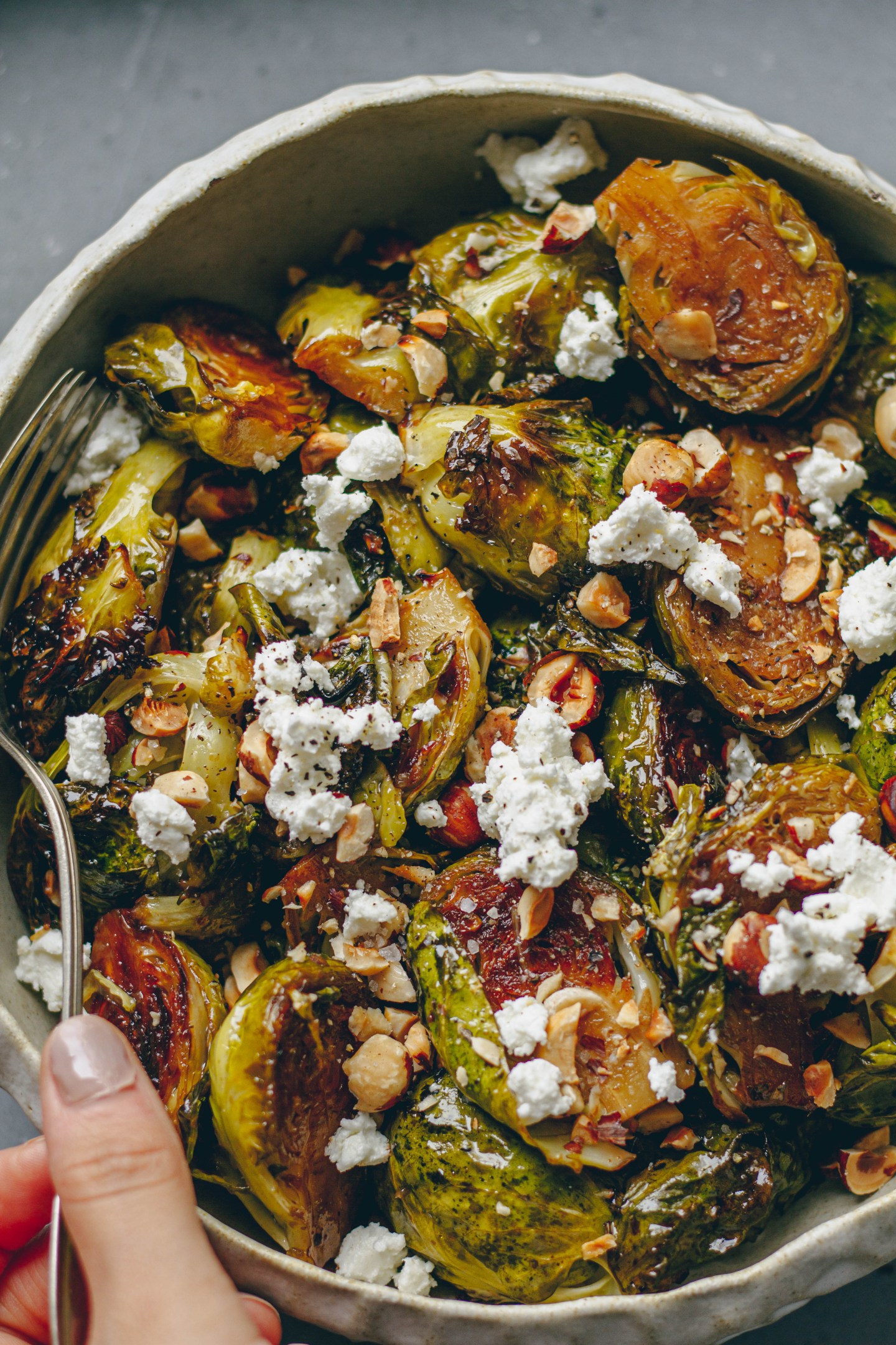 - Add roasted brussel sprouts to a large serving bowl. Pour over desired amount of vinaigrette (I added about ¾). Toss well to combine. Top with crumbled goat cheese, chopped roasted hazelnuts, and sprinkle of flaky salt. Enjoy!