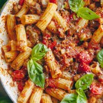 Keyword: healthy dinner recipe, roasted red pepper and eggplant pasta, vegan pasta recipe