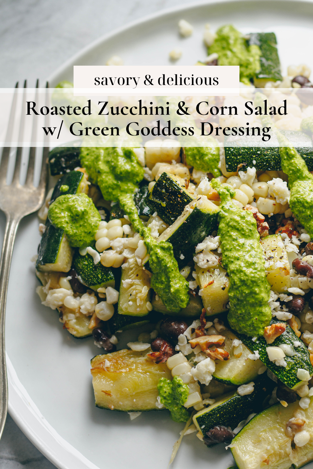 Fresh, nutrient-rich Roasted Zucchini & Corn Salad tossed in a creamy, bright green goddess dressing.