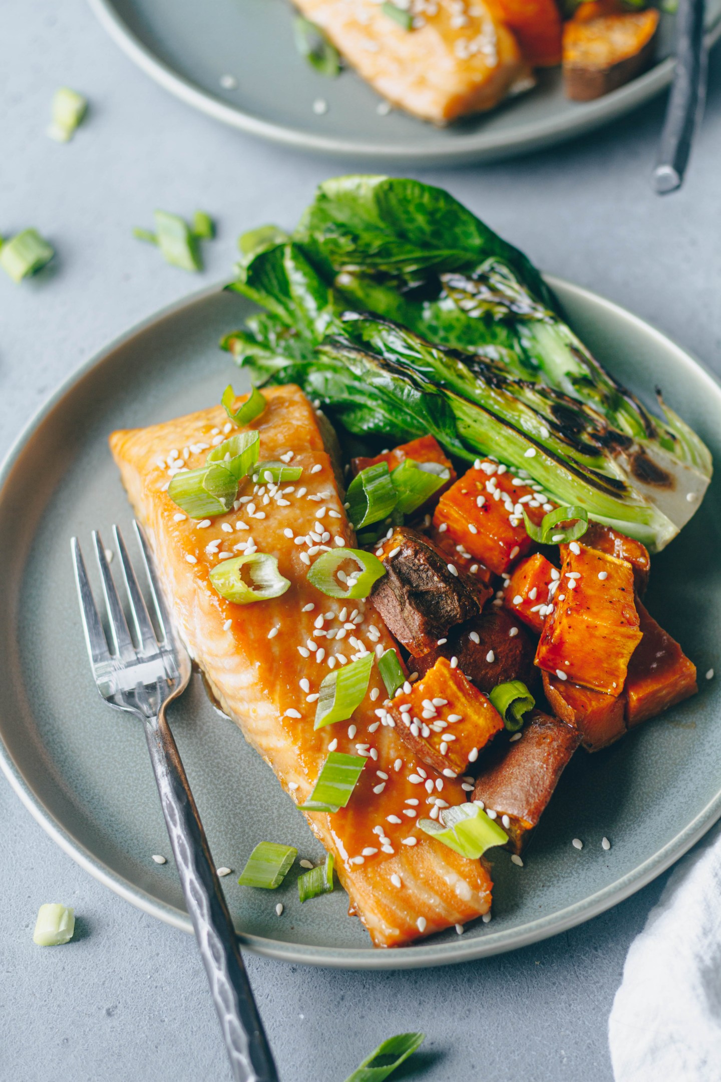 Both the salmon and sweet potatoes are baked on a sheet pan, roasted to perfection, then served with a simple and delicious miso glaze. That’s it! Ready in less than 45 minutes (not including marination).
