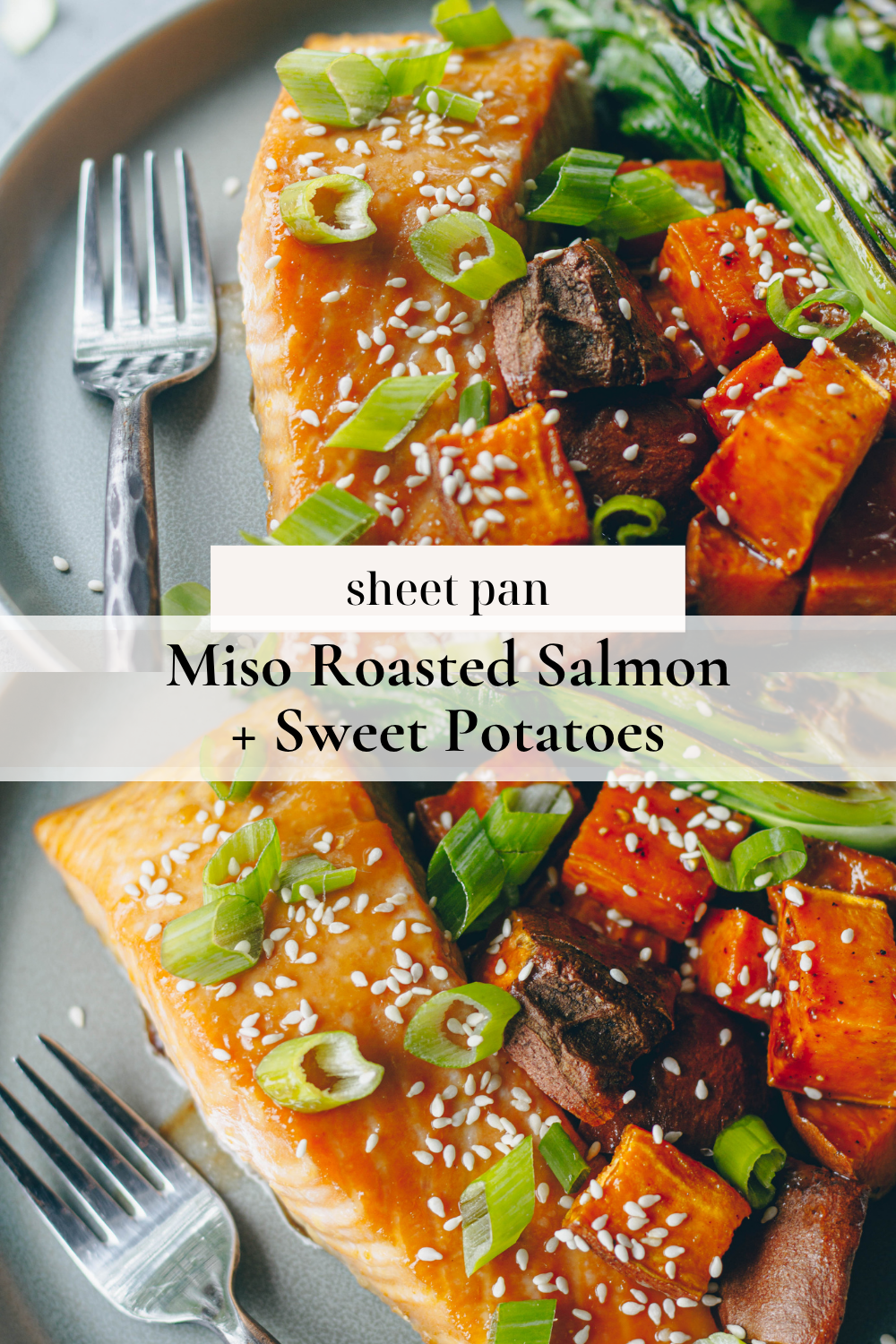 Easy and delicious roasted salmon and sweet potatoes in a sweet and savory miso glaze.