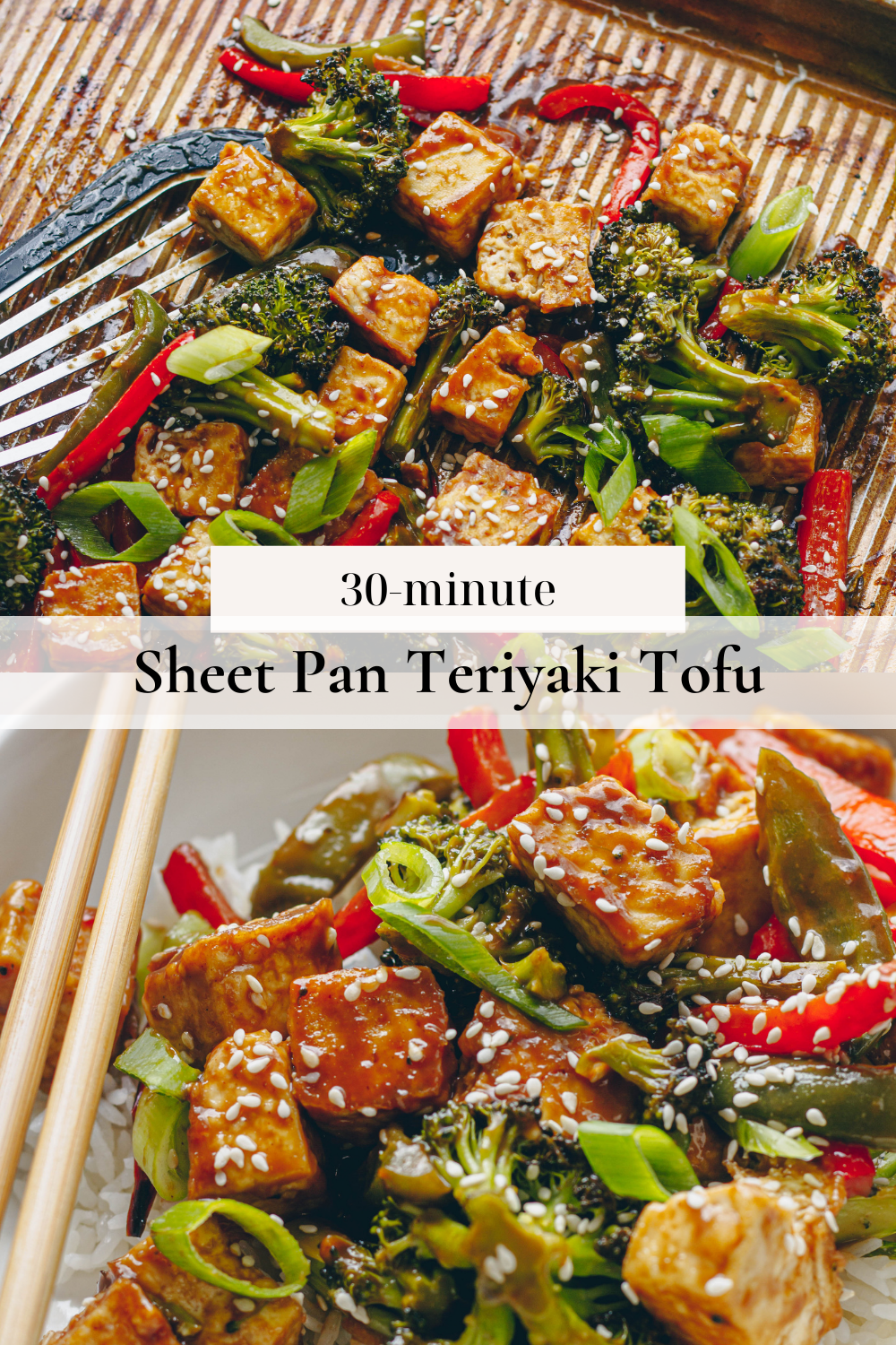 Flavor-packed one pan meal with baked tofu, veggies, and teriyaki sauce.