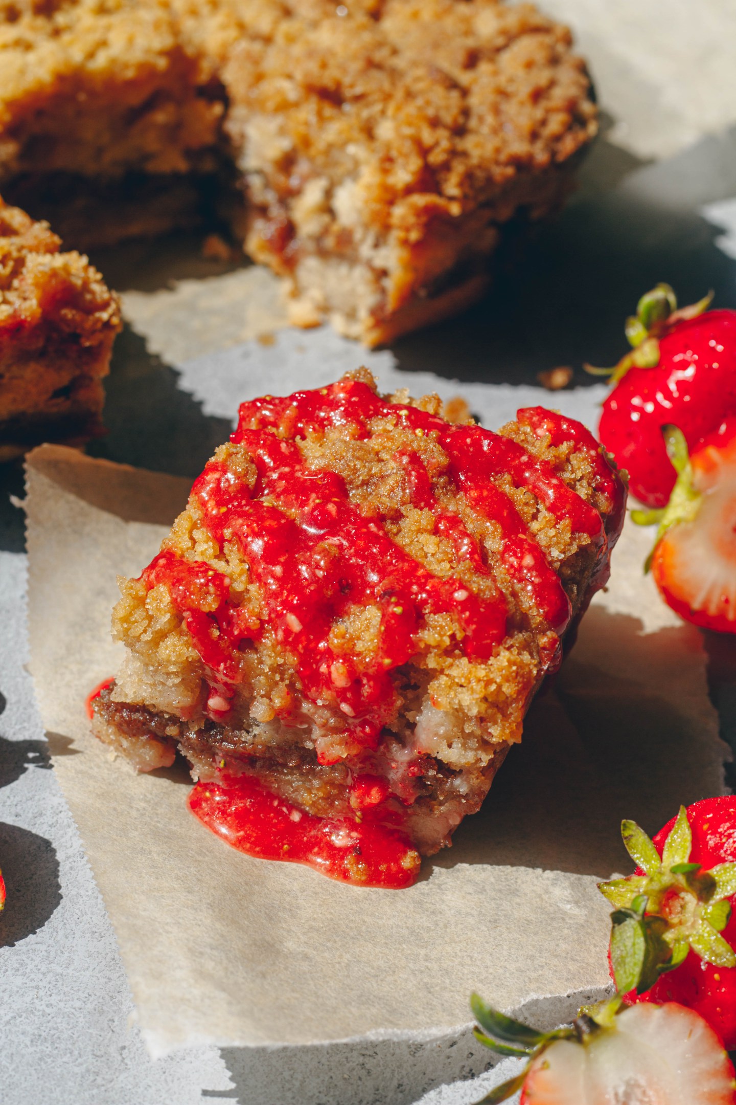 This coffee cake contains everything you could ask for – bursts of fresh strawberries, swirls of strawberry jam, a sweet cinnamon filling, and a buttery streusel topping.