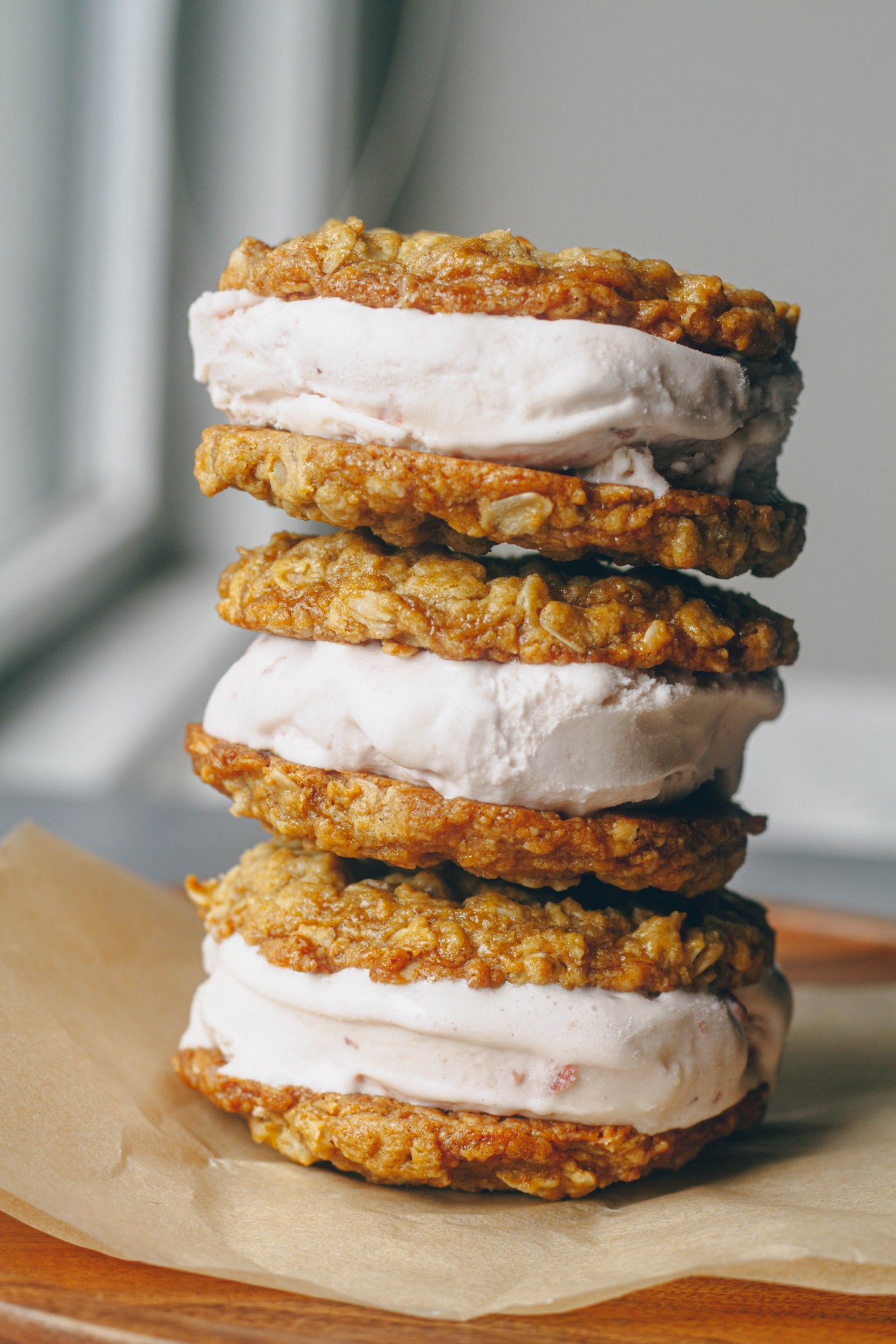 There’s nothing like a ice cream cookie sandwich on a warm summer day, especially when it’s homemade and ESPECIALLY when it’s strawberry ice cream sandwiched between homemade lemon oatmeal cookies.