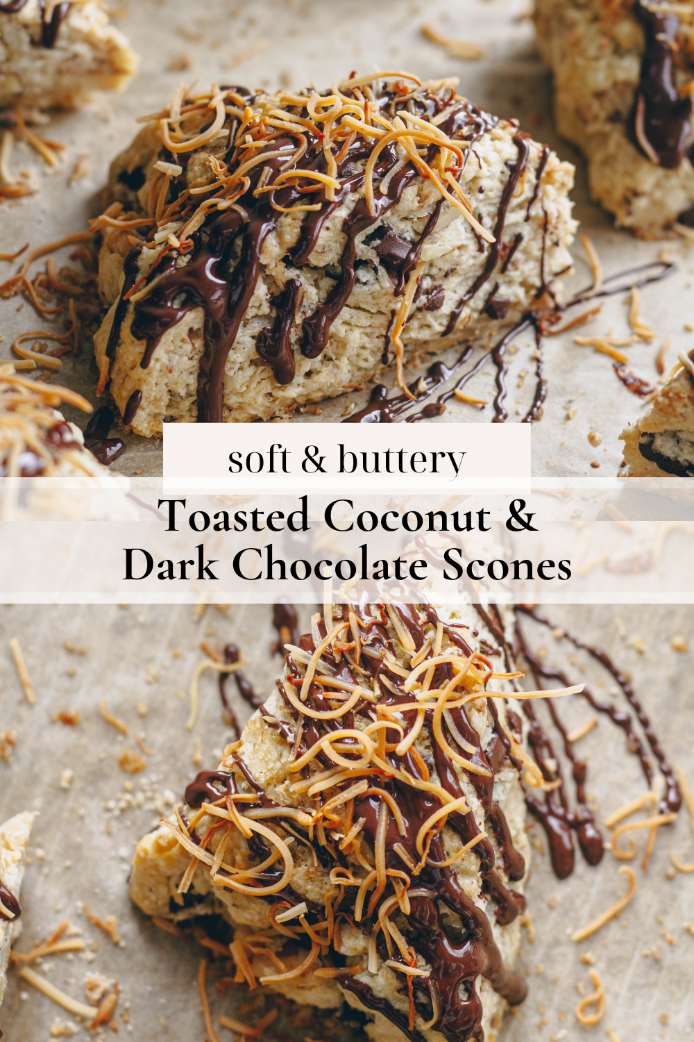 - Transfer scones to a wire cooling rack. While scones, are cooling, melt remaining â…“ cup chocolate. Top scones with drizzle of chocolate and sprinkle over remaining toasted coconut. Let set before serving and enjoy!