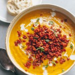 Creamy Butternut Squash Soup topped with a crispy vegan chorizo crumble.