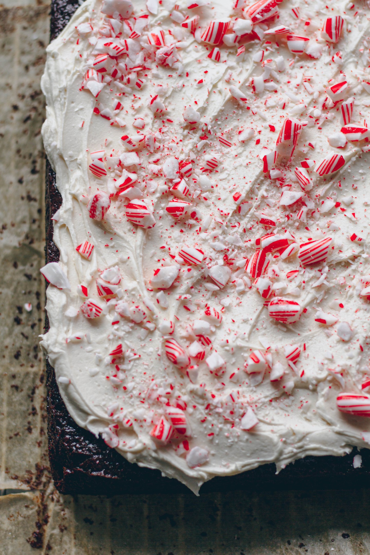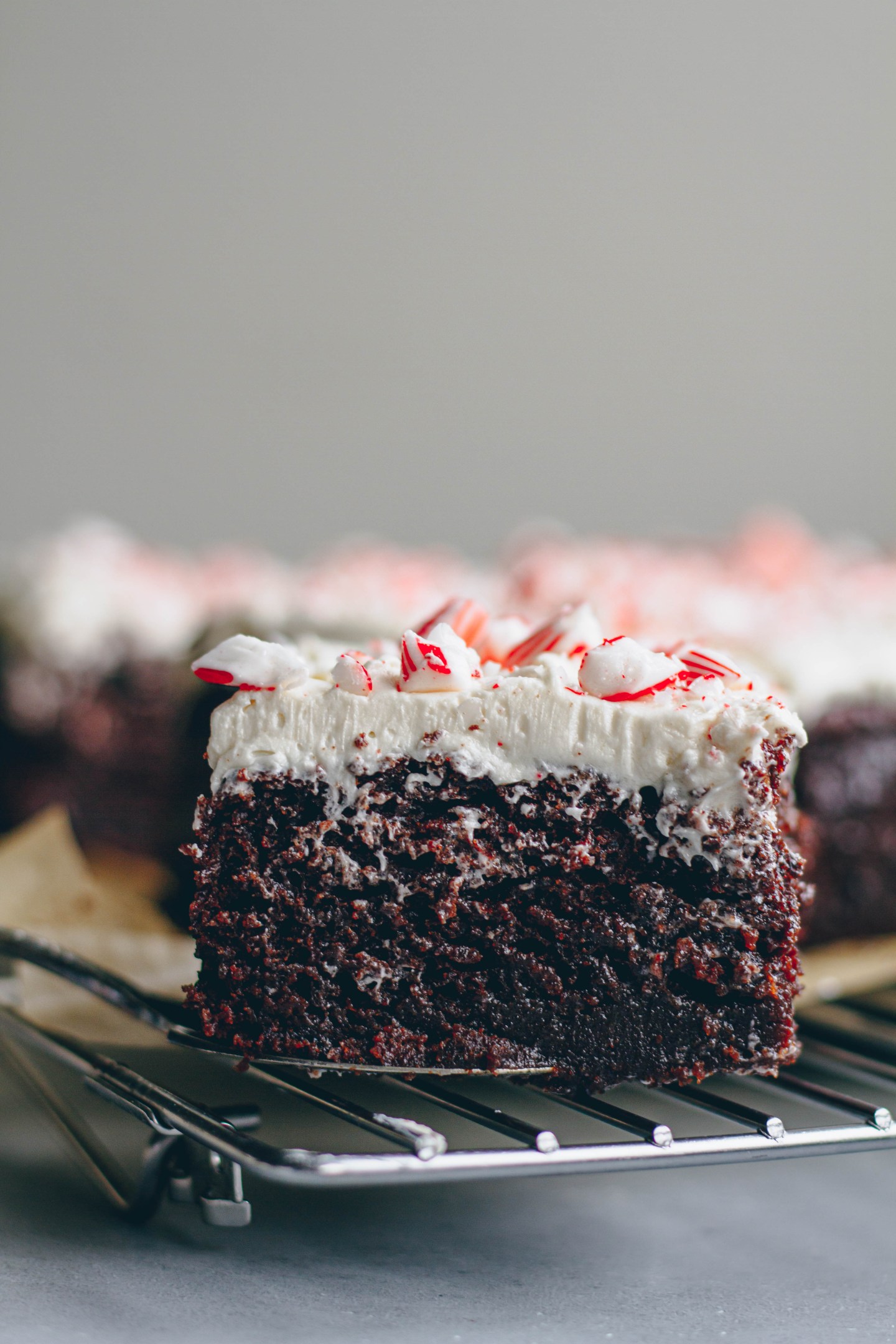 After the 5 minutes, beat in the non-dairy milk and vanilla extract until combined. Frost the cooled cake and top with crushed peppermint. Enjoy!