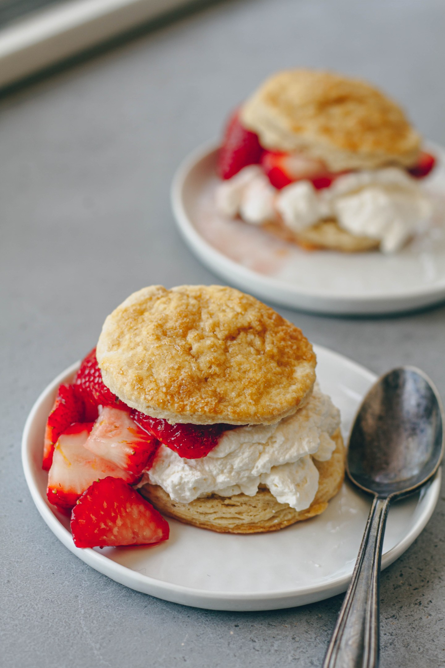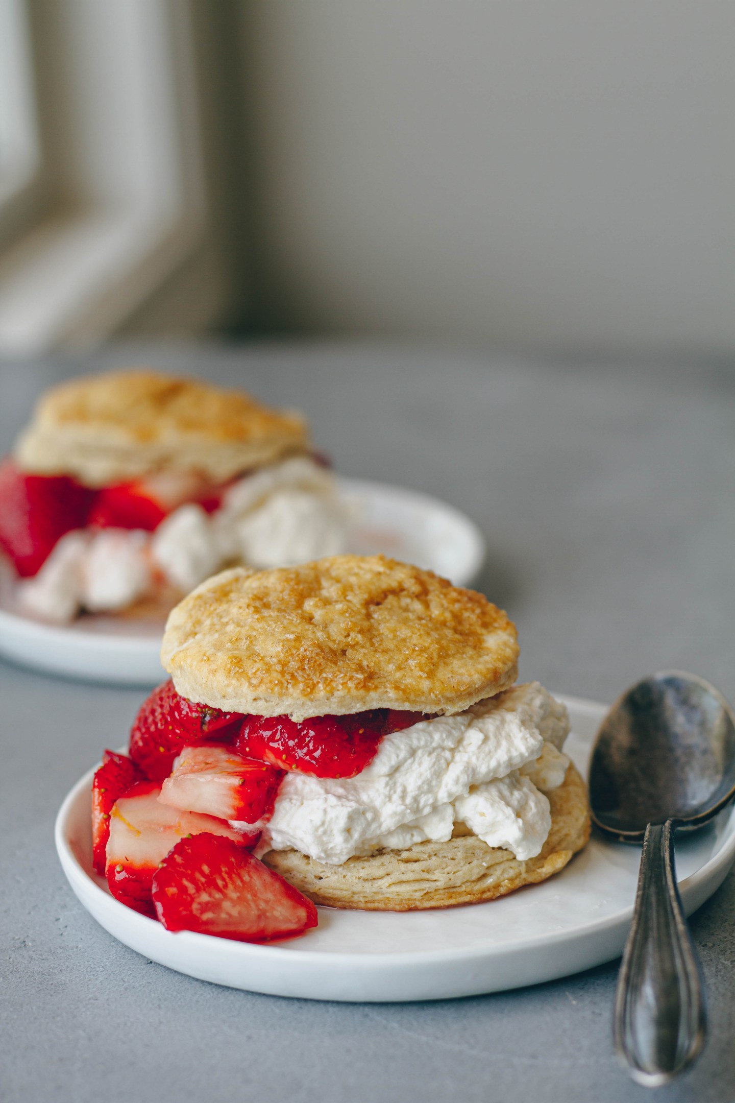 - Assemble strawberry shortcakes by separating the biscuit in half, topping with macerated strawberries and coconut whipped cream.